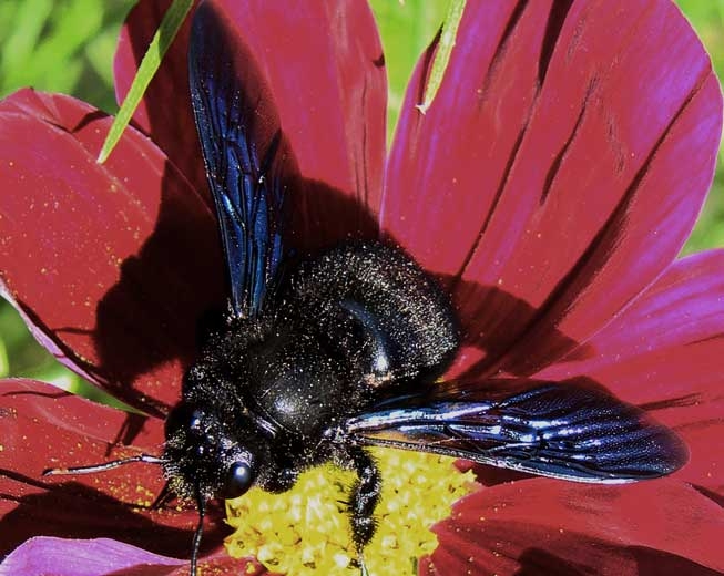 Les Xylocopes sont de couleur très sombre (noir violacé) avec des reflets métalliques pouvant faire penser à des coléoptères. Ces abeilles ont un corps très volumineux et peuvent mesurer jusqu‘ à 50 mm d’envergure avec les ailes déployées (figures 1 à 3).