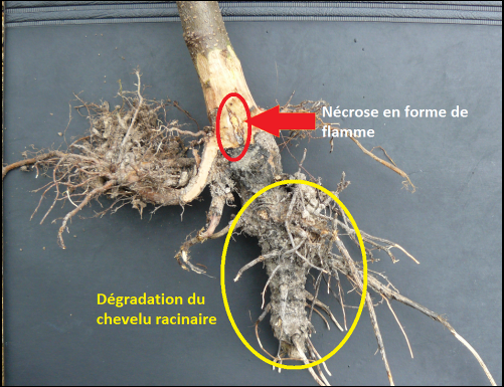 - nécroses de couleur brun à noir sur les racines