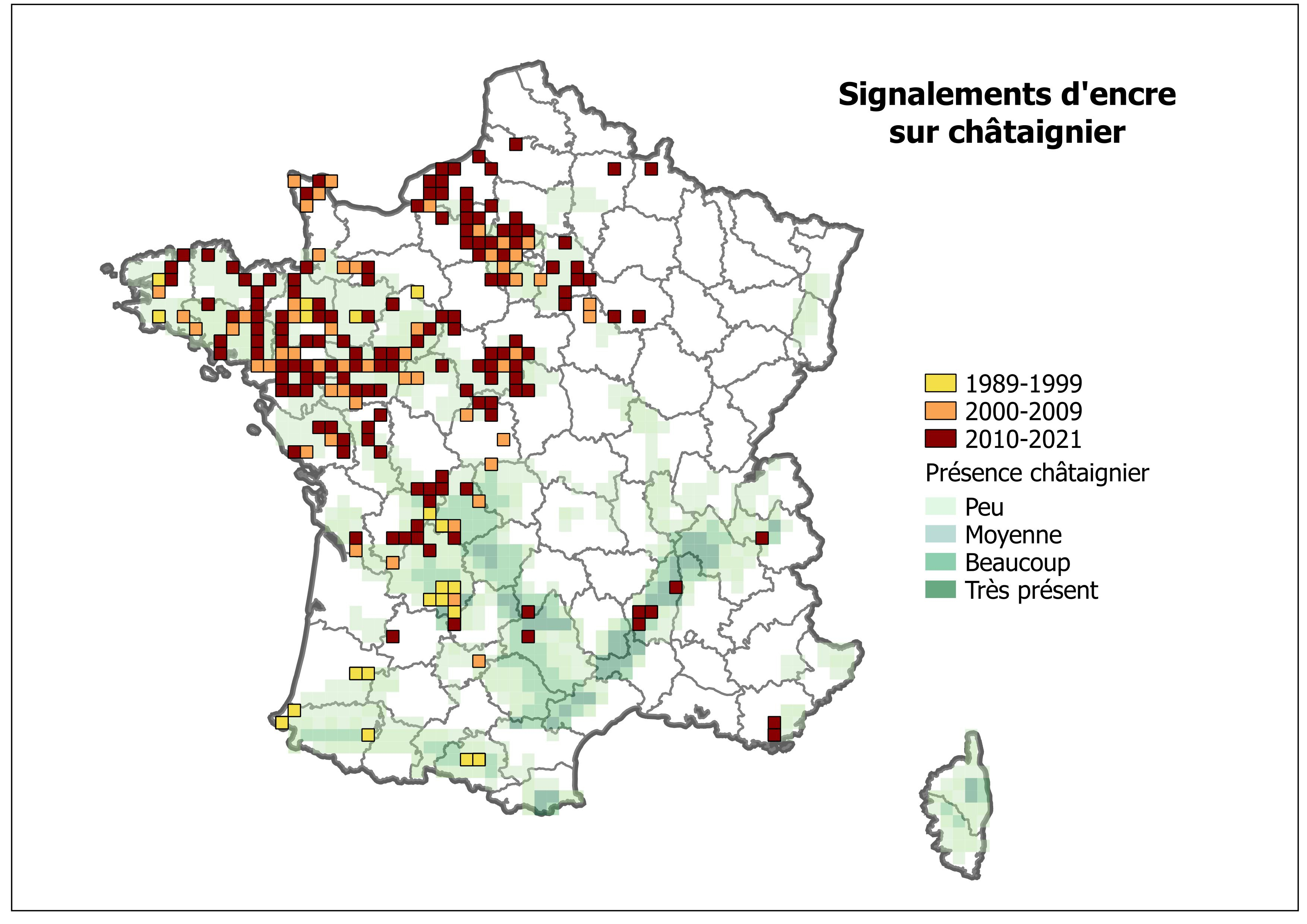 Cependant, depuis les années 2000, la maladie est en recrudescence en forêt. Cette augmentation est liée à une alternance de périodes humides et de périodes de sécheresses (1999-2002 années humides et 2003 sécheresse/canicule; 2013-2014 humides et 2015 sèches; printemps 2016 humide et été 2016 très sec ; printemps 2018 humide et été 2018 sec). Les périodes arrosées favorisent la production et la dissémination de spores et les périodes de stress hydrique sont préjudiciables aux châtaigniers attaqués qui n'ont plus le système racinaire suffisant pour compenser le manque d'eau. De plus, les hivers doux favorisent la survie du pathogène dans le sol. Un réchauffement climatique serait favorable à P. cinnamomi, d'autant plus que cette espèce est thermophile (optimum à 24-26°C).