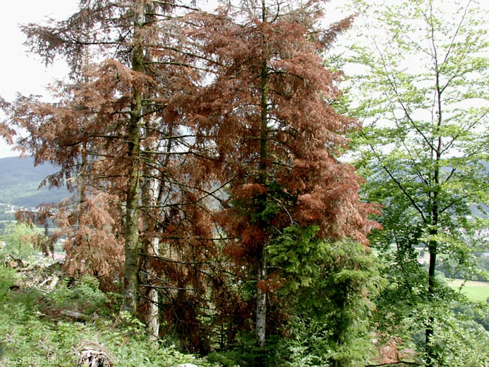 - Les arbres attaqués prennent une coloration grise puis rouille des aiguilles