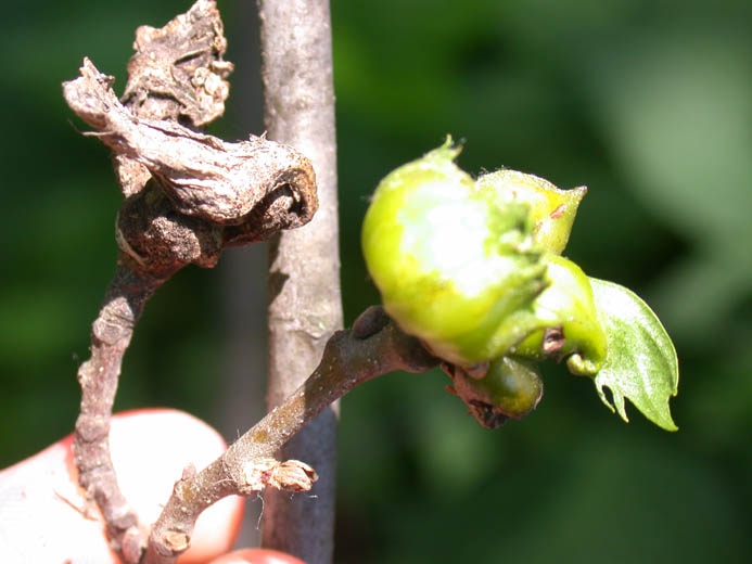 L’éclosion a lieu 30 à 40 jours après, puis les larves de premier stade passent l’hiver dans les bourgeons, sans qu’aucun symptôme extérieur ne soit visible. En avril, lors du débourrement, des galles de 5 à 20 mm se forment au fur et à mesure que la larve se nourrit. Les larves entrent en nymphose entre mai et juillet puis les adultes émergent et s’envolent entre juin et août.