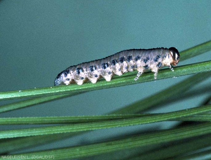 - Larves gris vert (25 mm) à tête et pattes thoraciques noires, portant une bande claire longitudinale dorsale. Elles se dressent en S quand elles sont inquiétées.
