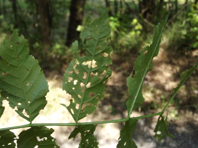 - Feuilles décapées puis rongées à leur tour apparaissant perforées par plage, grignotées