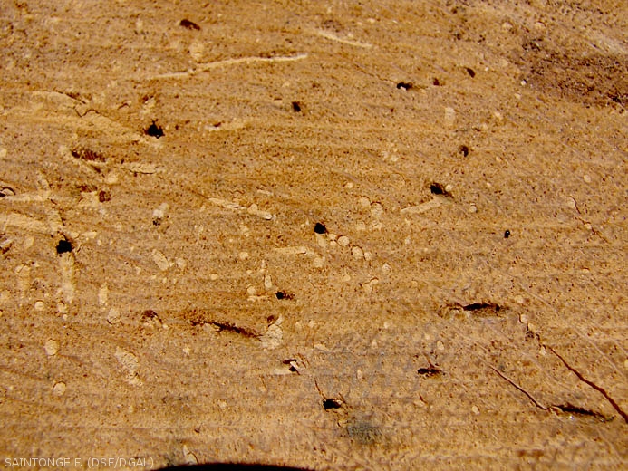 - Sciure blanche composée de très petits copeaux de bois, expulsée sur l'écorce au cours de l'activité de forage