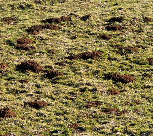 - Dégâts étalés dans le temps avec un maximum en fin d'hiver lorsque la nourriture habituelle manque (rhizomes de plantes herbacées).