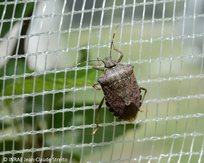 Punaise diabolique stoppée par un filet anti-carpocapse, en verger de pommiers