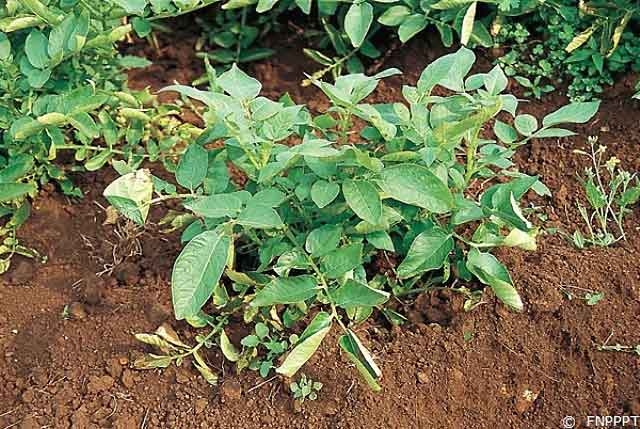 Dans le cas d’une infection primaire, les feuilles apicales sont de couleur plus claire et présentent parfois un port érigé . Les folioles situés sur le sommet de la plante sont légèrement enroulés vers l’intérieur à la base et présentent un jaunissement (photo 1). On peut noter quelquefois une pigmentation pourpre en bordure des folioles.