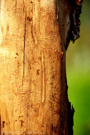 - En section transversale des rameaux ou des branches : coloration du bois par plages limitées par les cernes.