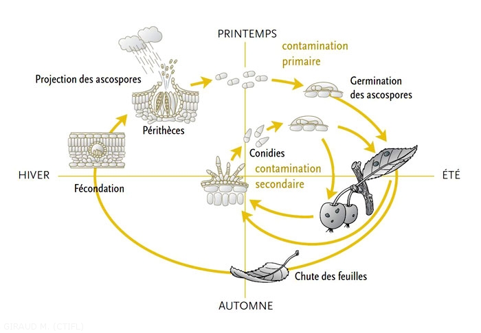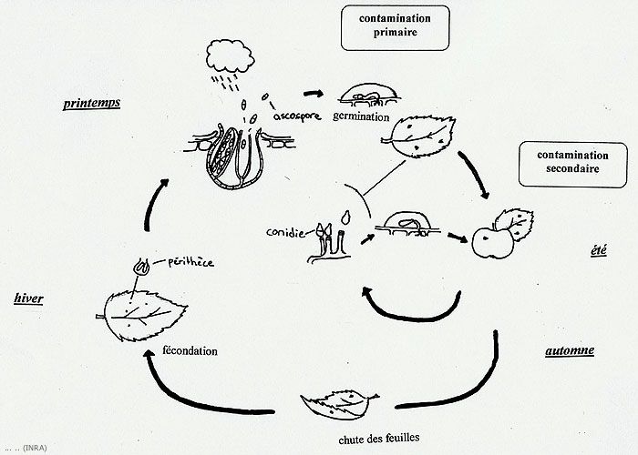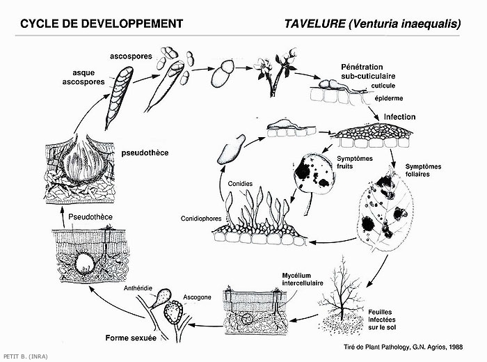 Le cycle biologique de Venturia inaequalis comprend 2 phases : une phase saprophytique dans les feuilles mortes au sol et une phase parasitaire sur les feuilles et les fruits (Figures 1 et 5)