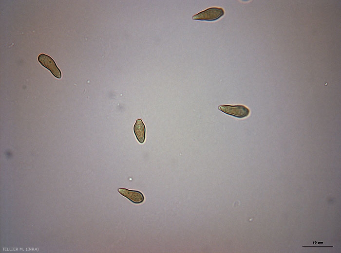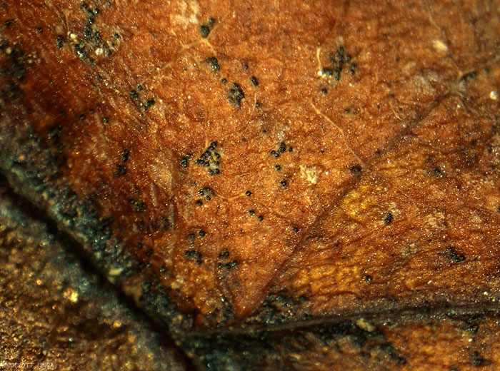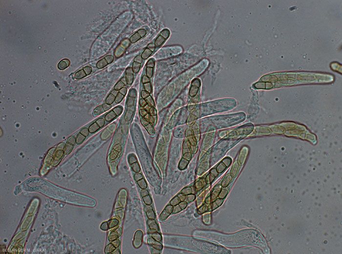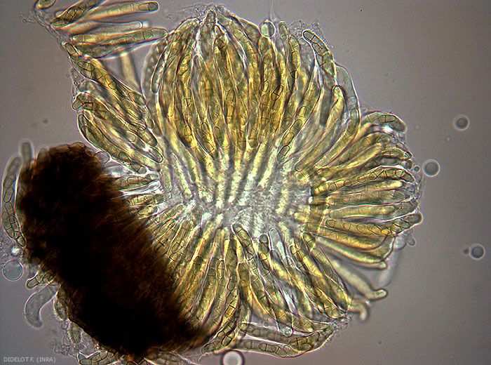 V. inaequalis se conserve pendant l’hiver dans les feuilles mortes au sol (Figure 9), sous sa forme sexuée, le pseudothèce, renfermant des asques (Figure 12) contenant chacune 8 ascospores (Figure 11). Les pseudothèces sont issus de la rencontre entre deux souches qui doivent présenter des signes sexuels opposés, on parle de champignon de type hétérothallique.