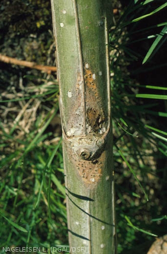 Nécrose brune déprimée et fendillement de l'écorce. Les nécroses peuvent devenir ceinturantes et causer la mort de la tige infectée.