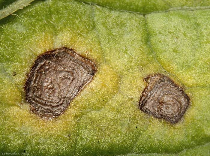 - Taches nécrotiques, bien délimitées, de taille variable, situées plutôt sur les feuilles du bas (figures 1 à 3).