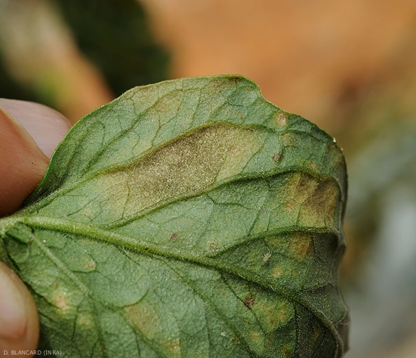 Des taches chlorotiques apparaissent à la face supérieure des feuilles attaquées par Pseudocercospora fuligena, elles sont similaires à celles induites par Passalora fulva. D’abord jaune pâle, elles ont un contour mal délimité (figures 1 à 4), s’étendent et finissent par se couvrir d’un duvet sporifère d’abord blanc, virant progressivement au noir (figures 5 et 6) au fur et à mesure de la sporulation. Ainsi, de larges macules couvertes d’un velouté noir mât peuvent parsemer le limbe, à terme, et être visibles aussi bien à la face supérieure qu’inférieure de ce dernier.