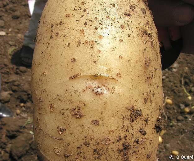 L’expression de la maladie sur les tubercules se caractérise par la présence d’un brunissement rougeâtre de l’anneau vasculaire, visible après avoir coupé les tubercules. Une pourriture beige puis brune (ce qui explique la dénomination de la maladie) se développe ensuite au niveau de cet anneau vasculaire (figure 4) et le tubercule finit par se décomposer. Une section (et une pression) du tubercule montre le suintement d’un exsudat bactérien blanchâtre au niveau de l’anneau vasculaire (figure 5).