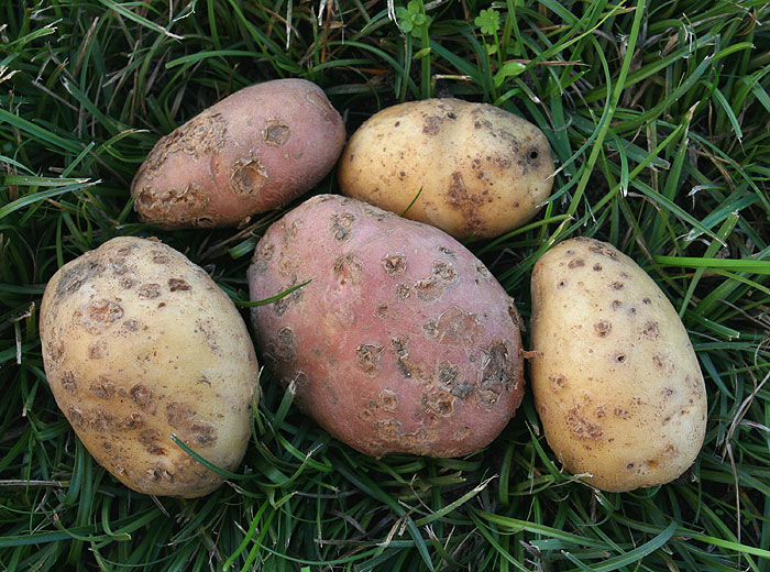 Sur des variétés sensibles, les lésions s’enfoncent en cratères (figure 1) dans les tubercules (figure 2 à 4) et des nécroses sont observées sur la base des tiges (figure 5) et des stolons. Sur d’autres variétés, les attaques peuvent se limiter à des  symptômes plus superficiels (figure 6) ou encore en étoile (figure 7).