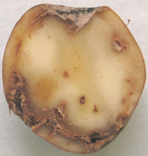 En phase extrême, le tubercule est craquelé en surface et des taches sombres apparaissent sous le périderme. Il se décompose ensuite sans odeur particulière et une cavité peut se creuser à l’intérieur (figure 4).