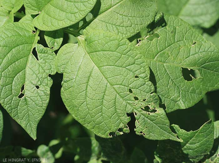 Ce ravageur, capable de consommer le tiers de son poids en une nuit, s’attaque essentiellement aux tubercules de pomme de terre mais il peut aussi défolier les plantes, en laissant des traînées de mucus caractéristiques (figures 5 et 6).Les pertes engendrées, aussi bien sur le plan qualitatif que quantitatif, peuvent atteindre les 30 % de baisse de rendement, voire aboutir au déclassement ou refus du lot de pommes de terre.