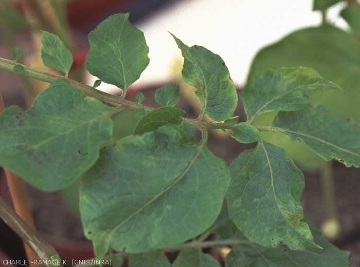Le symptôme le plus caractéristique sur feuillage consiste en des chevrons jaune brillant devenant nécrotiques (figure 1), mais il n’apparaît pas très fréquemment dans les conditions de culture. Différentes formes de mosaïques et de marbrures évoluant en taches nécrotiques peuvent également se manifester (figure 2), assez souvent sur les feuilles d’une seule tige (d’où le nom anglais de « stem mottle » = « marbrure de la tige »). Chez certaines variétés, notamment Santé et José, l’infection totalement systémique se traduit par la présence de taches chlorotiques, parfois halotiques (figure 3), à tendance jaune pouvant se manifester sur l’ensemble de la plante.