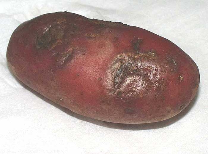 Des nécroses superficielles sont parfois visibles (figures 12 et 13). Elles peuvent former des anneaux centrés sur les lenticelles. Elles sont généralement assez peu caractéristiques et ne permettent pas d’établir un quelconque diagnostic. La coupe du tubercule montre que ces lésions ne sont pas toujours reliées aux nécroses internes et qu’elles peuvent rester localisées au niveau du périderme.