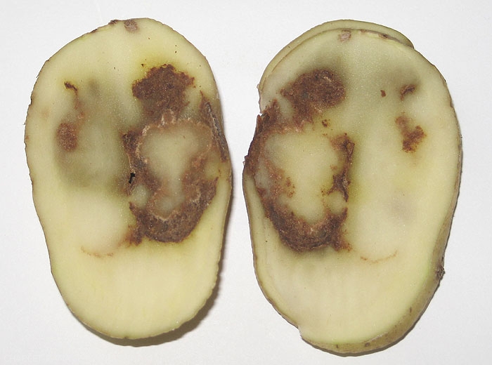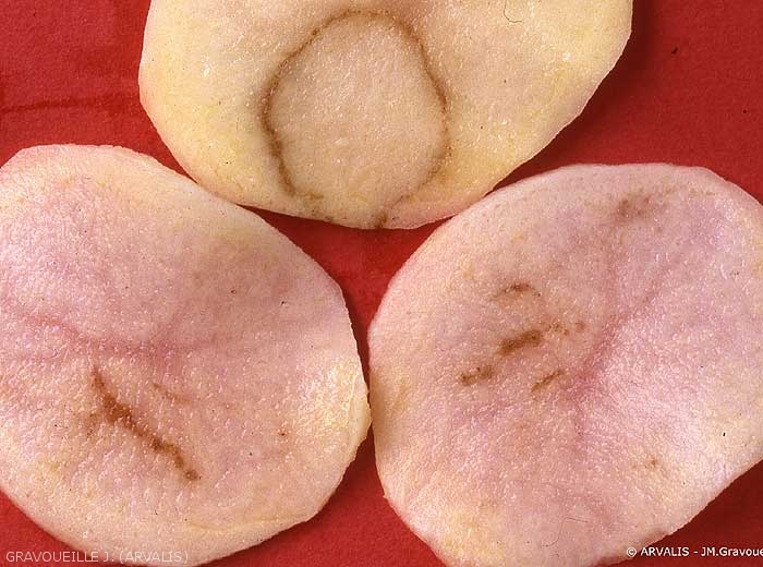 Les symptômes les plus typiques du TRV apparaissent le plus souvent à l’intérieur des tubercules (figures 4 et 5). Ce sont des arcs nécrotiques assez marqués ou des lignes sinueuses plus irrégulières (figures 6 à 11), pouvant s’élargir sous forme de taches liégeuses s’étendant à une grande partie du tubercule.