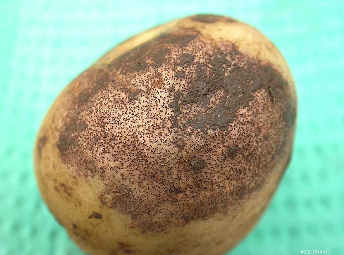 Le mycélium pénètre ensuite dans le tubercule, l’épiderme se crevasse, la chair se transforme en pourriture sèche plus ou moins grisâtre et le tubercule finit par se déliter complètement (figures 6 et 7).