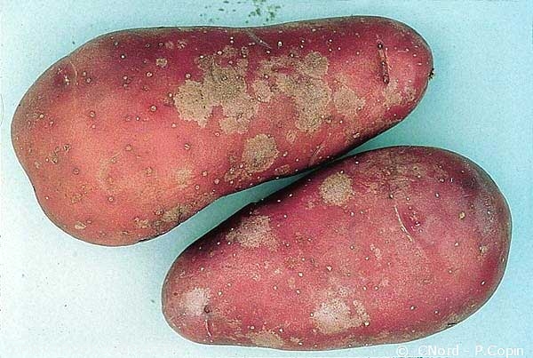 On observe sur le tubercule des plages claires, argentées (figures 1 et 2) qui sont bien visibles pour les variétés de pomme de terre à peau rouge (figure 3).
