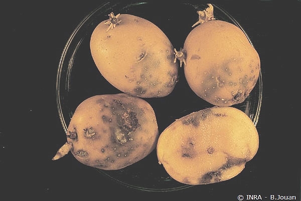 La pourriture des tubercules démarre souvent au talon, avec des brunissements en surface (figure 1) ; à l’intérieur, les zones atteintes sont séparées des zones saines par un liseré noirâtre.