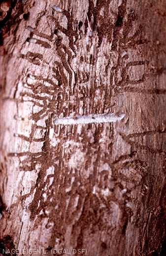 - Mortalité brutale des arbres en tache en cas de pullulation. L'écorce se détache par plaque sous l'effet des pics qui viennent consommer les larves