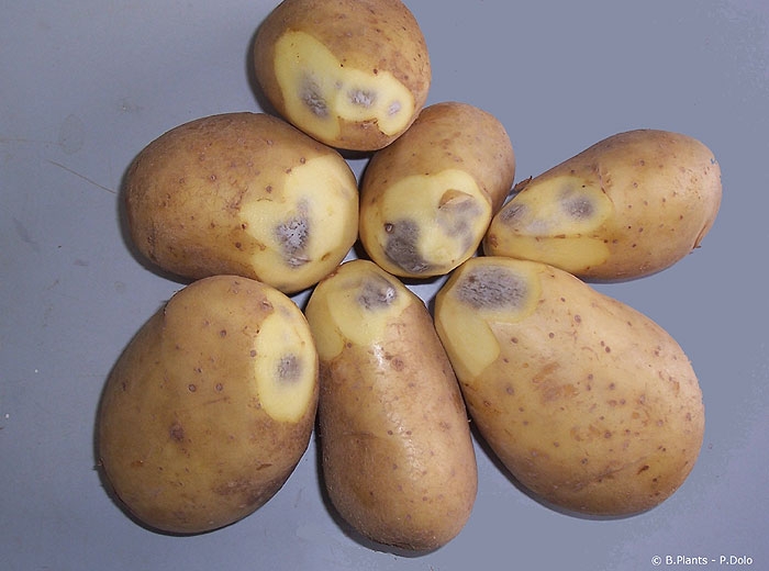 Le noircissement interne se caractérise par des taches sous-épidermiques de couleur gris bleuté (taches cendrées) d'un diamètre variable qui peuvent évoluer en profondeur dans la chair des tubercules et devenir noires dans les cas les plus graves (figures 1 et 2). Les symptômes apparaissent principalement du côté du talon. Pour que le noircissement interne se développe, il faut simultanément que les tubercules y soient sensibles et qu'ils aient reçu un choc ou qu'ils soient soumis à une pression.