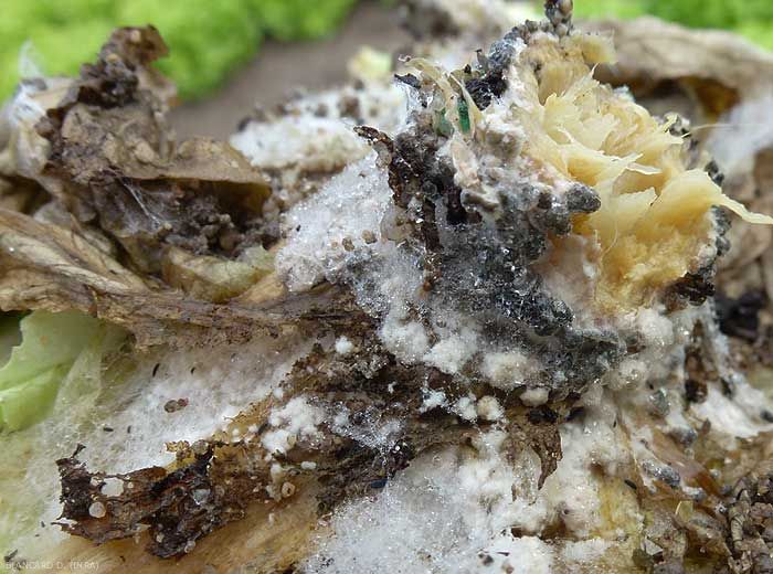 - Mycélium plus ou moins blanc plus ou moins persillé se formant sur tous les tissus affectés ;
