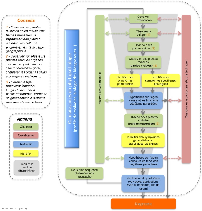 En fait, le diagnosticien est un véritable détective qui met en oeuvre une procédure construite à partir de ses connaissances*, de son expérience et surtout de sa pratique du diagnostic. Celle-ci est constituée théoriquement de séquences d’observations progressives de l'environnement, de la culture et des différents organes des plantes malades, mais aussi de questions ayant surtout pour objectifs de préciser le contexte de production. Plusieurs réflexions intermédiaires réalisées au cours du diagnostic permettent de faire le tri entre les différentes causes hypothétiques, de les hiérarchiser et les éliminer progressivement en utilisant si besoin différentes ressources ; grâce à une réflexion finale et au mêmes ressources, il est possible de faire un bilan et de conclure enfin à un diagnostic mettant en cause un facteur biotique ou abiotique, voire un complexe de plusieurs de ces facteurs.