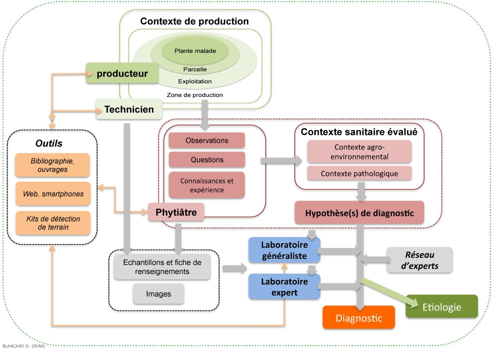 Le diagnostic d'une problématique phytosanitaire peut être réalisé directement au champ, sans moyens particuliers si les symptômes observés sur les plantes malades sont suffisamment caractéristiques, et associés à d'autres critères complémentaires. Parfois, il sera nécessaire d’expédier des échantillons et une fiche de renseignements à un laboratoire généraliste qui assurera l’identification de l’agent causal, ceci grâce à l’utilisation de méthodes de laboratoire plutôt classiques en phytopathologie. Certains cas pathologiques nécessiteront l’expertise de laboratoires experts, où des spécialistes (mycologues, bactériologistes, virologistes, entomologistes nématologistes, etc.) mettrnt à profit leur expertise et des méthodes plus sophistiquées, sensibles et spécifiques. Ce continuum (figure 1) de connaissances, d’expertises et de méthodes partagées et synergisées du terrain aux laboratoires sont les garants d’un diagnostic performant en protection des plantes.