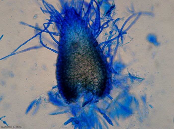 • Conseils : attention à ne pas les confondre avec des pycnides ! Au laboratoire, si elles sont pas matures, placer les échantillons dans une chambre humide et réaliser des observations à intervals réguliers par la suite afin d'étudier la morphologie des ascospores.