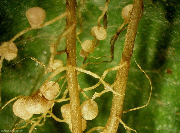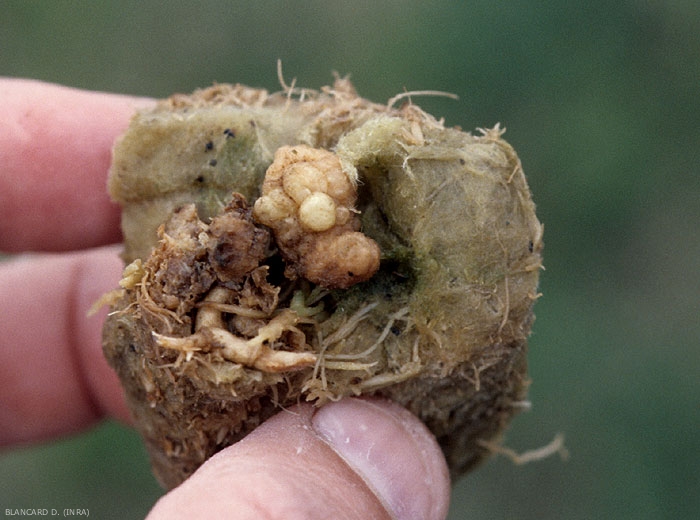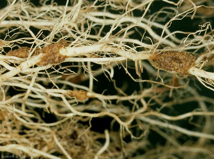 - Description : excroissances, renflements sphériques à allongés, localisés surtout sur les racines, parfois le collet de nombreuses cultures légumières.