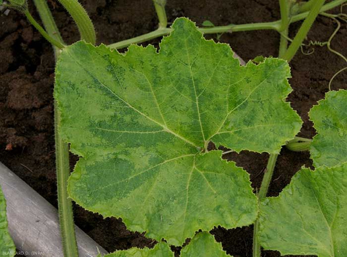 - détailler les apex et les jeunes feuilles afin d'y rechercher une hypothétique manifestation d'une marbrure ou d'une mosaïque (ombrer les feuilles afin de mieux observer ces derniers symptômes), d'un jaunissement, de déformations diverses, etc. ;