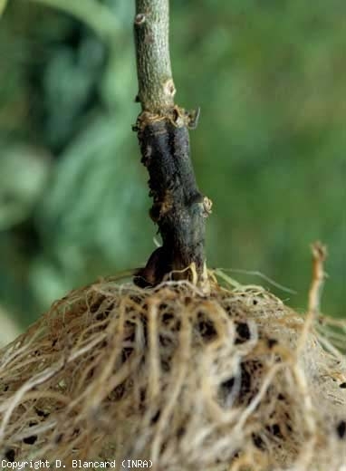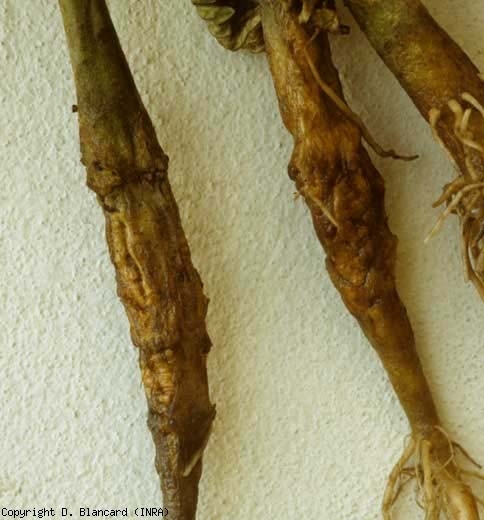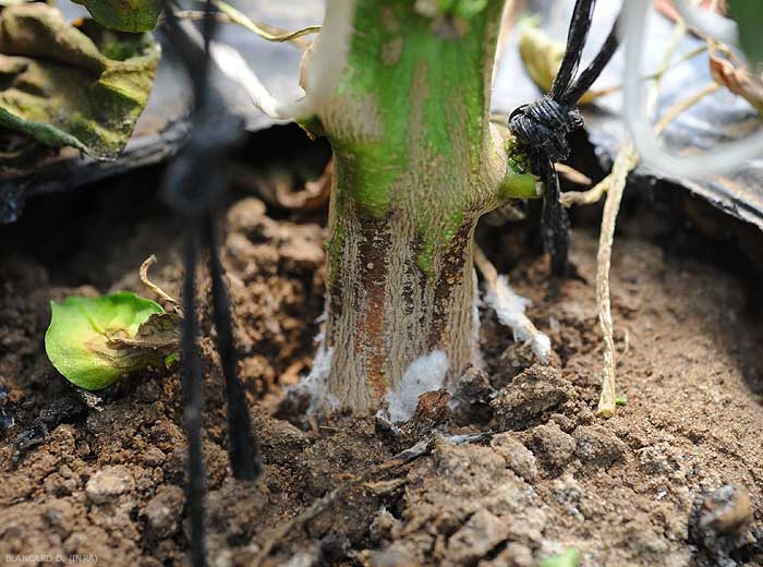 - lésions, pourritures plus ou moins humides, brunes à noires, ceinturant le collet (figures 1 à 5) : plusieurs champignons et Oomycètes telluriques (Rhizoctonia solani, Sclerotium rolfsii, Sclerotinia sclerotiorum, Botrytis cinerea, Didymella spp., Pythium spp., Phytophthora spp., etc.), un excès d'eau, etc. ;
