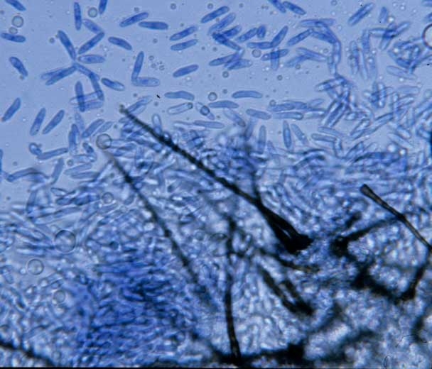 - Conseils : au laboratoire, l'observation des conidies présentes sur les tissus végétaux altérés ne pose normalement pas de problème. Repérées grâce à la loupe binoculaire, elles peuvent être détaillées après préparation microscopique entre lame et lamelle et observation au microscope photonique. Si elles sont absentes, placer les échantillons dans une chambre humide et réaliser des observations à intervalles réguliers.