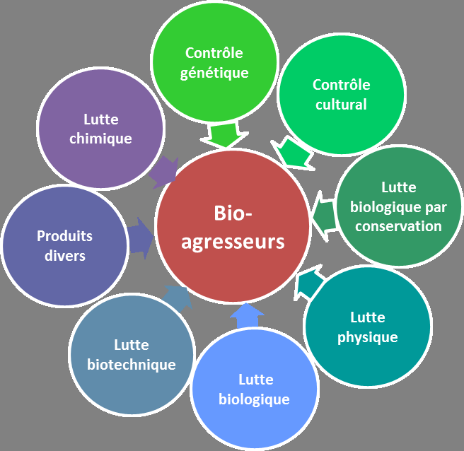 Les moyens de lutte alternatifs ont souvent, tout comme la lutte chimique, une action directe sur le bio-agresseur ciblé (luttes biologique, physique, biotechnique, avec divers produits peu préoccupants pour l’environnement et la santé humaine) : ils se substituent complètement ou partiellement à l’utilisation des produits phytopharmaceutiques. Les méthodes permettant de contrôler préventivement le développement des bio-agresseurs ou de réduire la sensibilité des cultures aux attaques participent plutôt à la re-conception des systèmes (contrôle génétique, contrôle cultural).