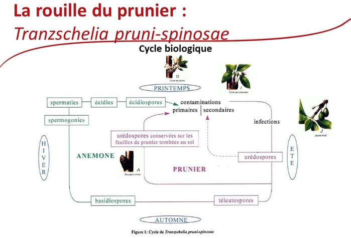 La rouille du prunier est hétéroxène, c'est à dire qu'elle a besoin de deux hôtes de nature botanique différente pour réaliser son cycle complet : Prunus (prunier, pêcher, abricotier, amandier) puis anémone sauvage ou cultivée. L'anémone n’est pas ou peu présente dans le sud-ouest de la France, le cycle de la rouille devient autoxène : le champignon arrive à compléter son cycle sur un seul hôte, le prunier. Cette capacité est due à la longévité remarquable des urédospores libres qui résistent aux rigueurs de l’hiver sur et dans les feuilles mortes. La capacité de germination de ces spores durerait de 5 à 7 mois après leur formation.
