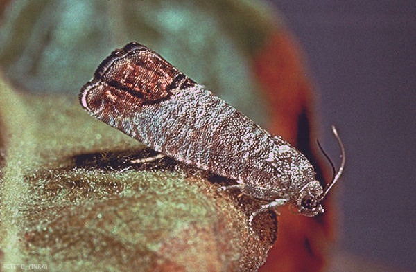 Par la suite, elle devient rose clair. Il n’y a pas de peigne anal, ce qui la distingue de la tordeuse orientale (Grapholita molesta) et de la petite tordeuse des fruits (Cydia lobarzewskii). La chrysalide, brun jaune à brun foncé, mesure 9 à 10 mm. Le papillon mesure 15 à 22 mm (figure 6).