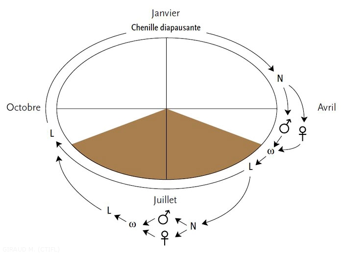 Selon la climatologie de la région concernée, l'insecte présente 2 ou 3 générations par an (cycle biologique en figure 1).