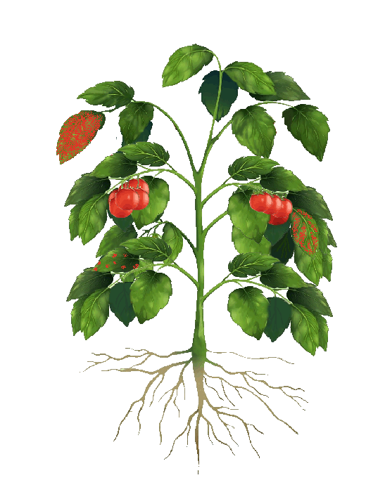 Symptômes couramment observés: flétrissement, taches et lésions foliaires plus ou moins étendues et nécrotiques en fin d'évlution, etc.