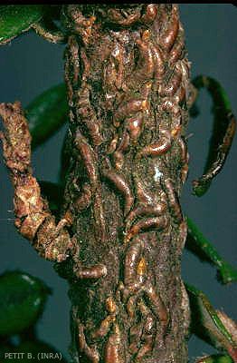 Les cochenilles sont des insectes piqueurs. Elles se fixent sur les plantes (figure 1) et se nourrissent de la sève en injectant leur salive souvent phytotoxique. Cela provoque le dépérissement progressif des branches puis de l’arbre. Les piqûres sur fruits sont auréolées de rouge sur l’épiderme. Sur troncs et branches, les pullulations de cochenille virgule s'observent facilement par des encroutements de boucliers de couleur marron (figure 2).