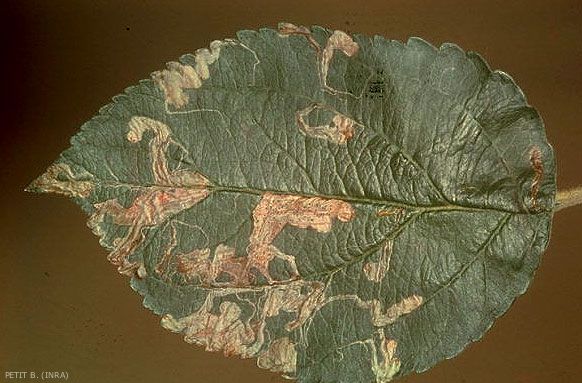 Les dégâts sont facilement identifiables. La larve de la mineuse des feuilles des arbres fruitiers creuse des mines qui serpentent dans le limbe sans tenir compte des nervures (figures 1 et 2). En fin de cycle, la mine s’élargit en une cellule terminée en cul-de-sac. La chenille sort de la feuille pour se nymphoser.