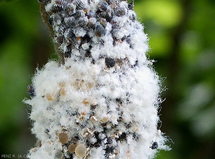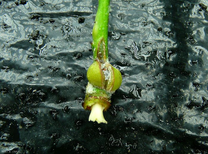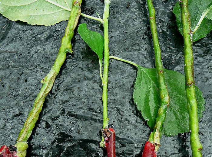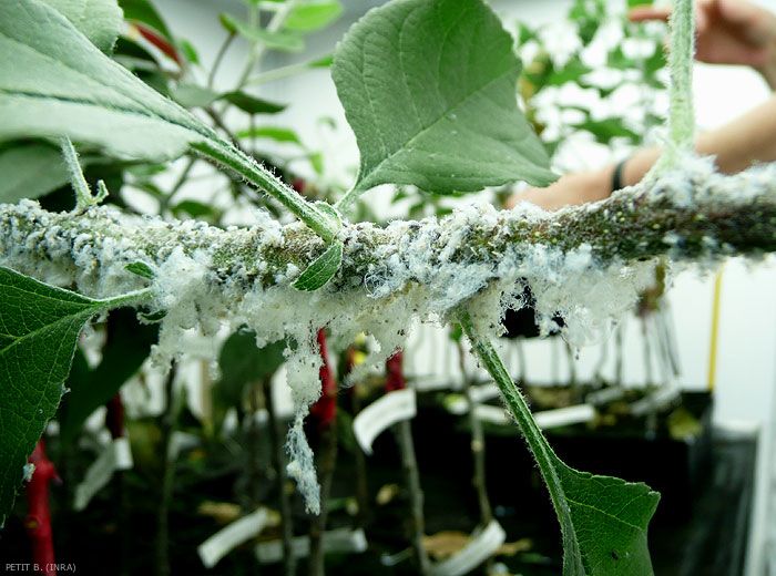 Sur les rameaux et les branches (figure 1), les piqûres des pucerons provoquent la formation de boursouflures puis de galles (figures 2 à 4) et enfin de chancres qui peuvent permettre l’attaque de pathogènes secondaires, notamment des champignons.