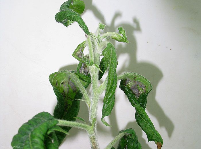 Les colonies importantes (figures 1, 2 et 3) provoquent l’enroulement et la déformation des feuilles (figures 4 à 10) et des rameaux (pseudo-galles).