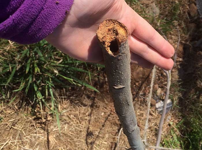 Les indices de la présence de chenilles sont l’accumulation d’excréments et de particules de bois qui sont rejetées par les trous d’entrée et le dessèchement des branches qui peuvent casser sous l’action du vent (figures 3 et 4).