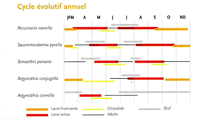Il y a deux générations par an. Au dernier stade de son développement, la chenille mesure quatorze mm et elle est de couleur jaunâtre à verdâtre.