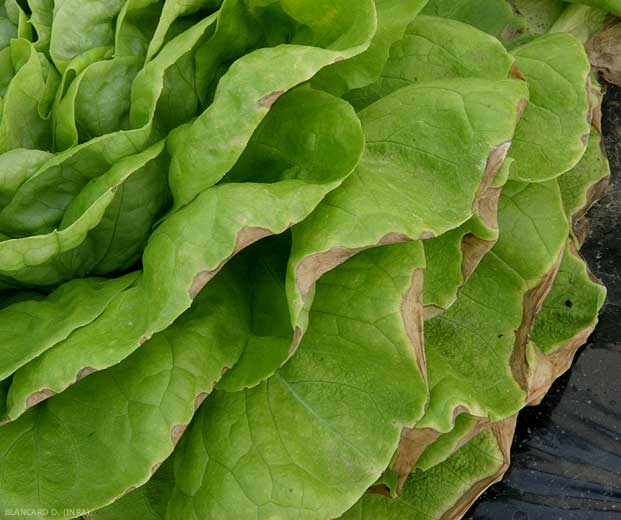 • Maladies des légumes associées à l'élément :  nécroses marginales de la laitue (figures 1 et 2) et de l'épinard, probablement le coeur noir du céleri, nécrose apicale de la tomate (figures 3 et 4), vitrescence du melon (figure 5), noircissement des fleurs du chou fleur, etc.