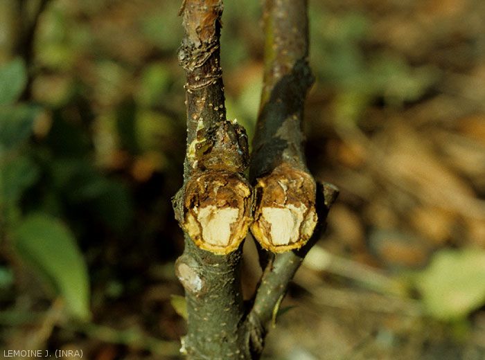 Si, à l’inverse, on pose quelques écussons malades sur le Virginia Crab, le rejet du virus va se manifester en 2 à 3 mois par des nécroses du xylème et du phloème, localisées autour des greffons. Cette réaction est retenue pour détecter l’ASGV avec une bonne fiabilité.